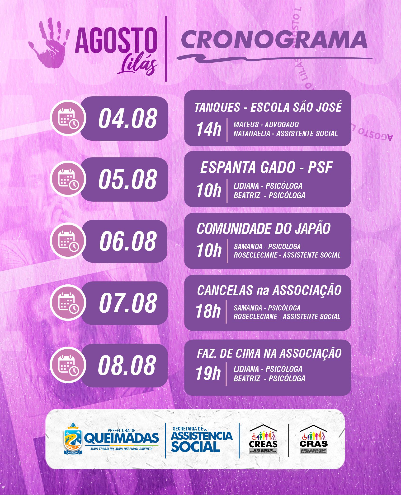 A campanha Agosto Lilás chega com uma programação especial em Queimadas, reforçando a importância da conscientização e do combate à violência contra a mulher. Através de rodas de conversa nas comunidades, profissionais do CRAS e CREAS levarão informação, escuta e acolhimento a diversas localidades.
